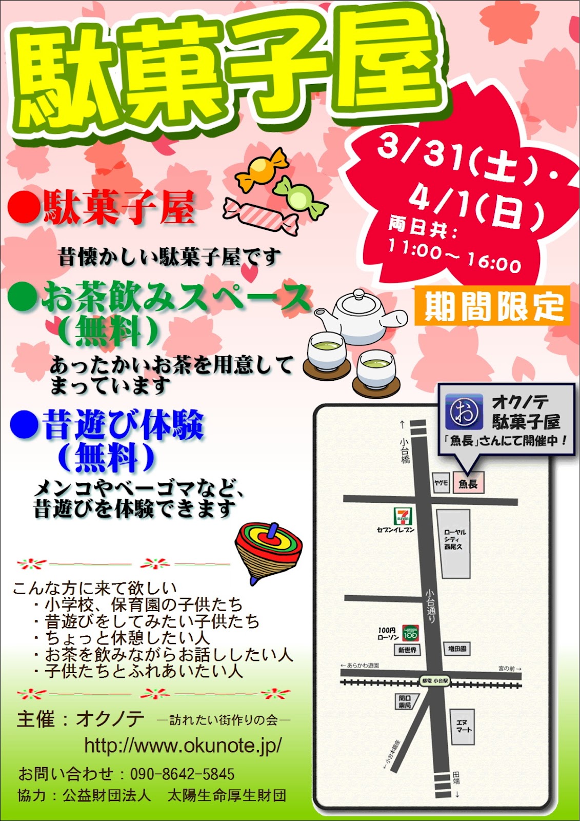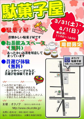そう!「駄菓子屋」やっちゃいます!ただの駄菓子屋ではございません!昔の遊びメンコやベーゴマなど無料で体験できます。お茶も無料で飲めちゃいます!!