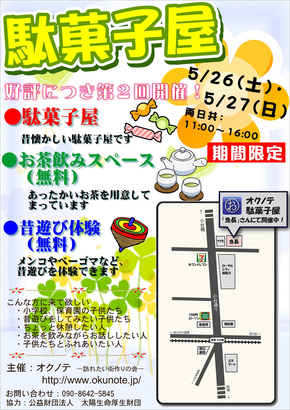 3/31 , 4/1 に開催した『オクノテ presents 駄菓子屋&昔あそびスペース』が好評につき、第2回が開催されることになりました。【日時】 5/26(土) 5/27(日) 2日間限定