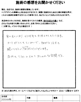 家の近くにありもう何年も利用させてもらっています。カットがとても丁寧で細かな注文も聞いてもらいいつもありがとうございます。店内もリフォームされておしゃれな空間です。